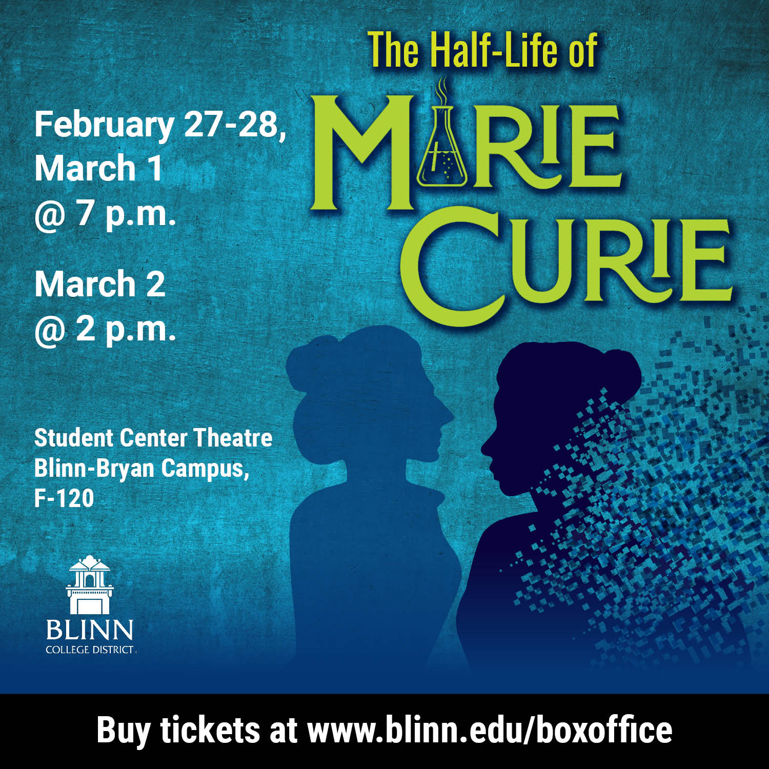 The Blinn-Bryan Theatre Troupe season continues in February with Lauren Gunderson’s “The Half-Life of Marie Curie.” After winning the Nobel Prize in Chemistry for her discovery of the elements radium and polonium, a widowed Marie Curie becomes the object of ruthless gossip over an alleged affair with a married Frenchman. As scandal obliterates her scientific achievements, Curie takes refuge with her friend and colleague, electromechanical engineer and suffragette Hertha Ayrton on the British coast. An ode to the power of female friendship, “The Half-Life of Marie Curie” explores the heights and depths of the lives and careers of two remarkable and fearless scientists.