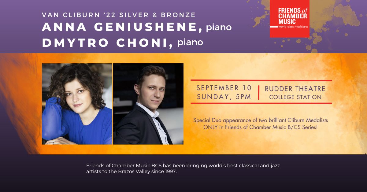 Friends of Chamber Music presents two winners of the Van Cliburn International Piano Competition 2022 in the opening concert of the 28th season series, Silver medalist Anna Geniushene and Bronze medalist Dmytro Choni, on Sunday, September 10 at 5 pm in Rudder Theatre on the campus of Texas A&M University in College Station, TX. A joint appearance of Cliburn medalists is a rare event, as each artist is a thriving solo pianist. Between their individual touring schedules over the 23/24 season, they found one date that allows them to come together for the Friends of Chamber Music series. We are thrilled to launch our new season with this special concert that highlights each pianist’s individual mastery and also features them as a duo. The Van Cliburn International Piano Competition that began in 1962 in Fort Worth is considered one of the world’s most prestigious piano contests. Winning a Cliburn medal means achieving the highest standards of today’s piano performance on a large international scale. Last summer, Ms. Geniushene, born in Moscow and trained in Russia and England, was awarded Silver medal at Cliburn ’22, and Mr. Choni, born in Kyiv and trained in Ukraine and Austria, became Cliburn ’22 Bronze medalist. Busy developing their individual diverse and versatile artistic careers as soloists and in collaborations with chamber music ensembles, both Geniushene and Choni have been performing to critical acclaim in world’s major concert venues, appearing with famed conductors, and sharing their talents with other musicians in collaborative performances.